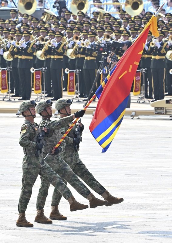 9月3日,紀(jì)念中國人民抗日戰(zhàn)爭暨世界反法西斯戰(zhàn)爭勝利80周年大會(huì)在北京隆重舉行。這是戰(zhàn)旗方隊(duì)接受檢閱。