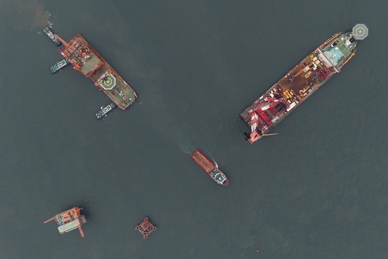 這是9月8日在渤海海域拍攝的墾利6-1油田10-1北區(qū)塊Ⅱ期開發(fā)項目油氣平臺安裝作業(yè)現(xiàn)場(無人機照片)。