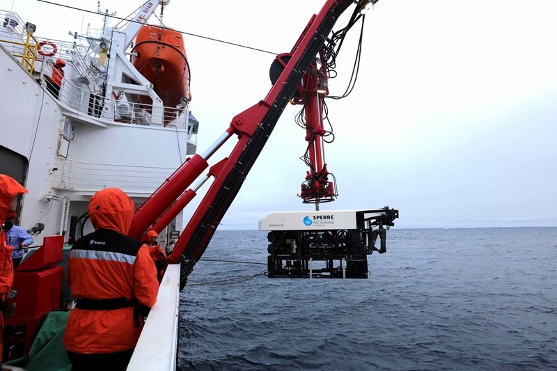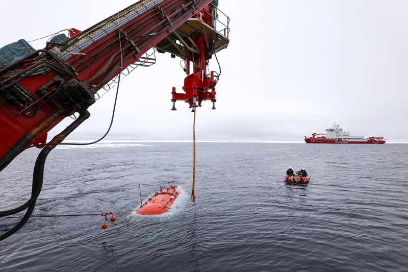 8月7日,科考隊員將ROV(無人遙控潛水器)放入水中。