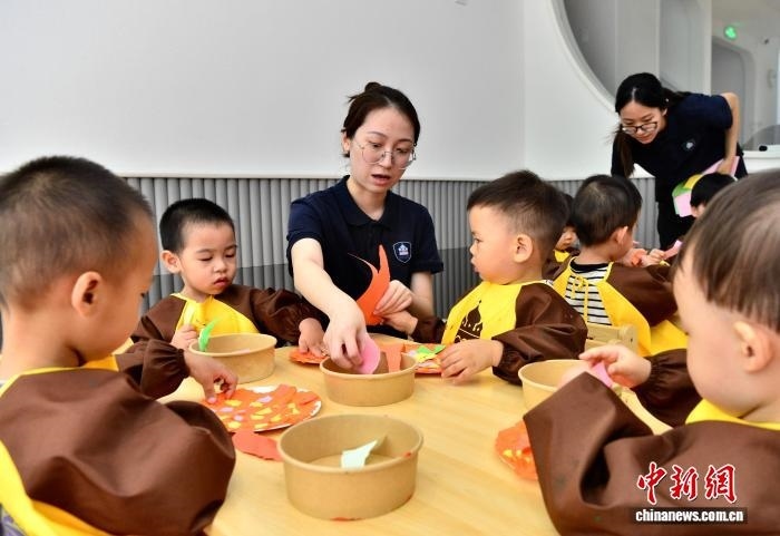 7月29日,福州新星托育園東街園老師指導小朋友進行藝術創(chuàng)想,制作美味的“披薩”。近年來,當?shù)胤e極推動公辦幼兒園和社會力量興辦發(fā)展托育教育服務,以解決民眾“帶娃難”的問題?!≈行律缬浾?張斌 攝