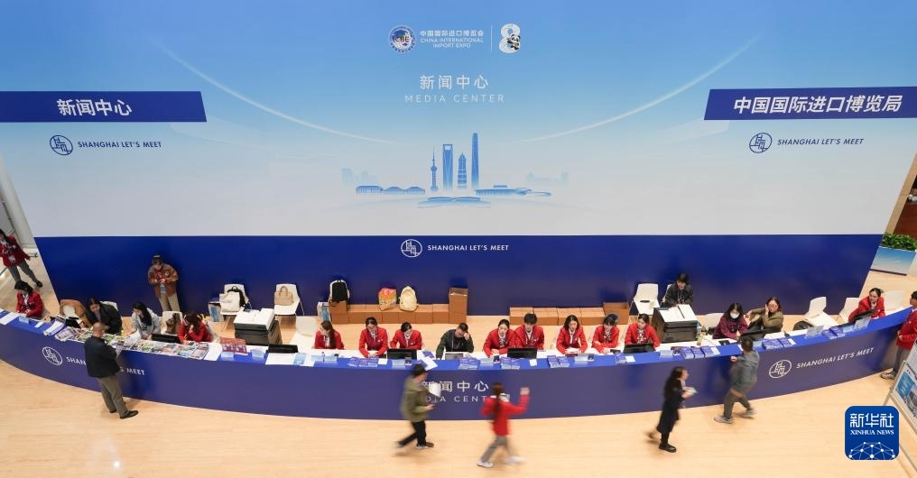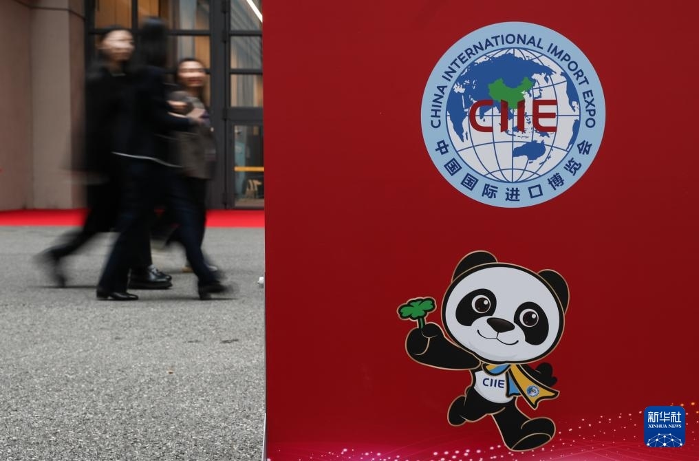 這是11月4日在第八屆進博會舉辦場地——國家會展中心(上海)拍攝的進博會宣傳標識。