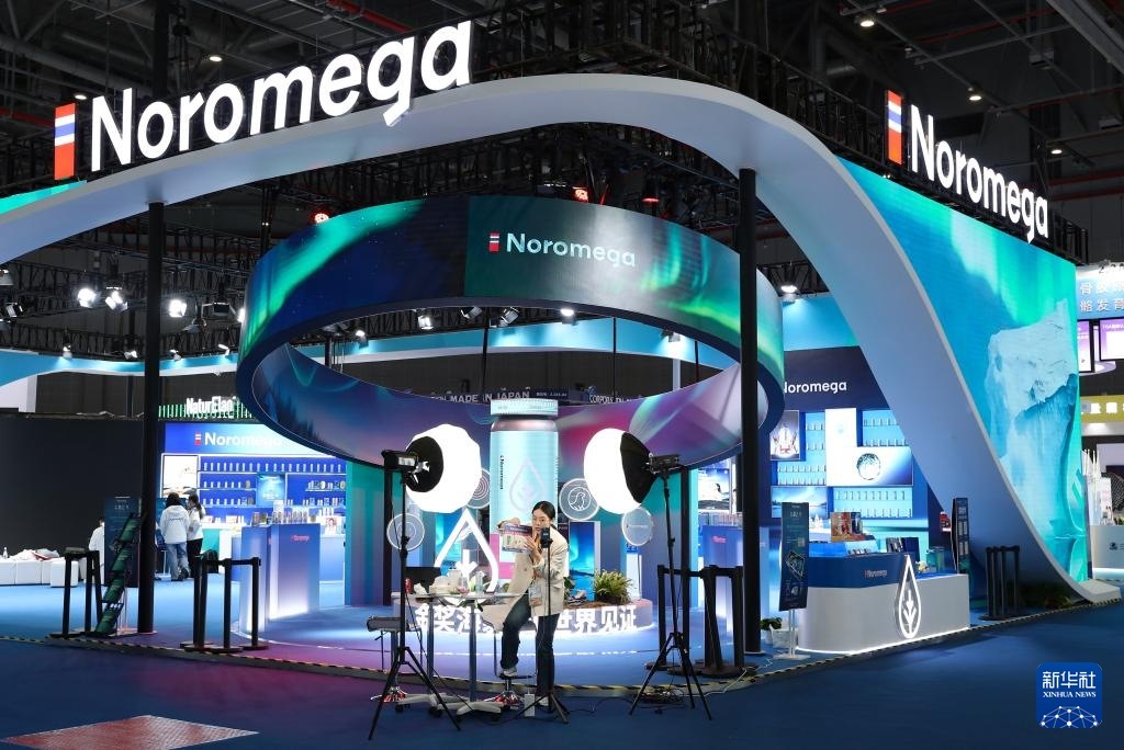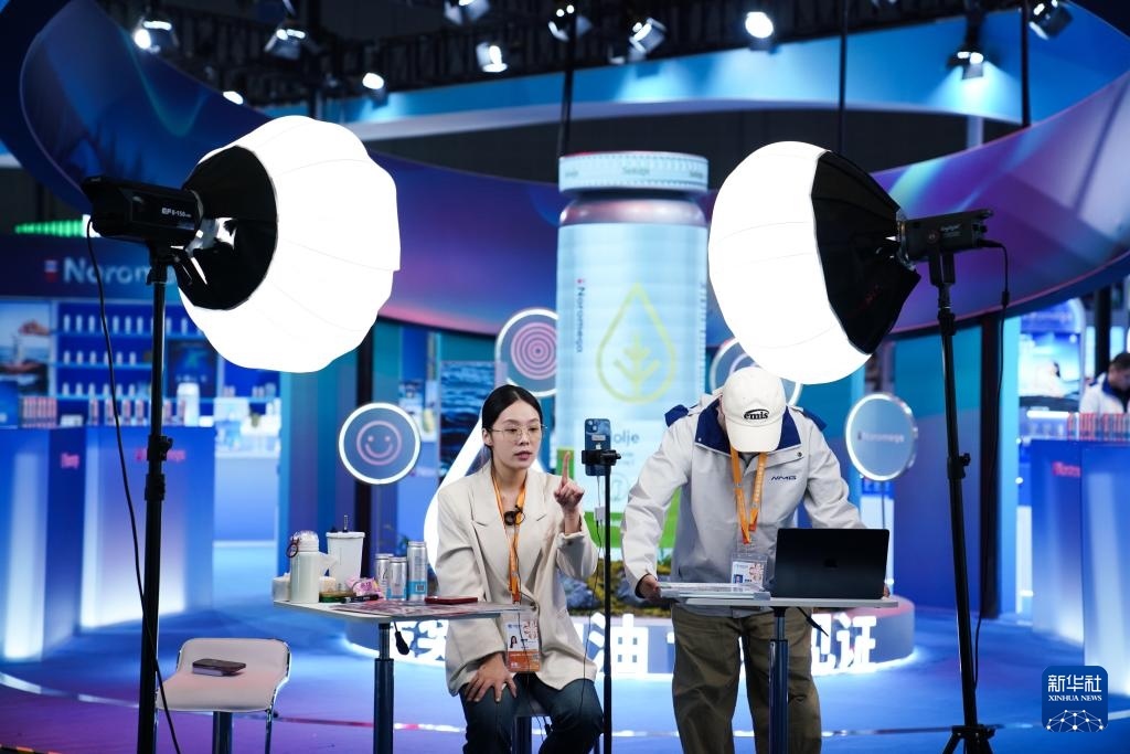 11月4日,工作人員在第八屆進博會醫(yī)療器械及醫(yī)藥保健展區(qū)直播。