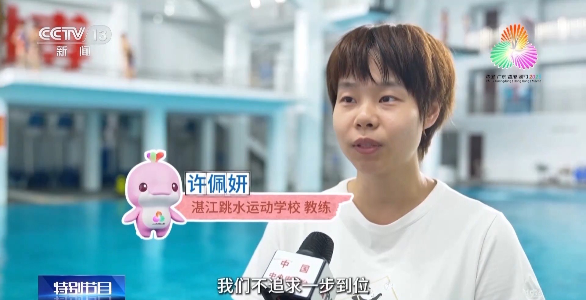湛江跳水運動學(xué)校教練 許佩妍:我們不追求一步到位,因為我們很多孩子都是海邊長大的,喜歡追波逐浪,那么他們來了以后,我們先讓他們愛上水,愛上跳躍,正是這份興趣成為他們成長最大的基礎(chǔ)。