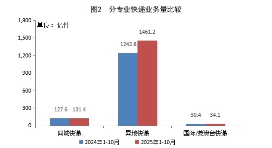 1—10月,同城快遞業(yè)務(wù)量累計(jì)完成131.4億件,同比增長(zhǎng)3.0%;異地快遞業(yè)務(wù)量累計(jì)完成1461.2億件,同比增長(zhǎng)17.6%;國(guó)際/港澳臺(tái)快遞業(yè)務(wù)量累計(jì)完成34.1億件,同比增長(zhǎng)12.2%。