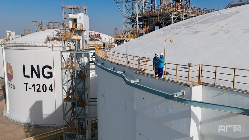 記者和采訪對(duì)象站在20萬(wàn)立方米的LNG儲(chǔ)罐上(央廣網(wǎng)記者 楊夢(mèng)奎 攝)