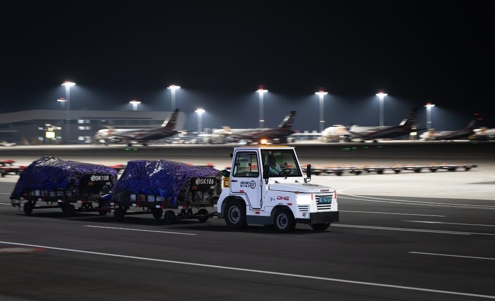 子夜時(shí)分,記者驅(qū)車來(lái)到這座機(jī)場(chǎng)時(shí),撲面而來(lái)的是一派“不夜空港”的繁忙景象:雪亮的停機(jī)坪上,貨機(jī)剛一停穩(wěn),工作人員便操控牽引車、加油車、轉(zhuǎn)運(yùn)車簇?fù)矶?,卸貨、加油、檢查,井井有條,一刻也不耽誤。