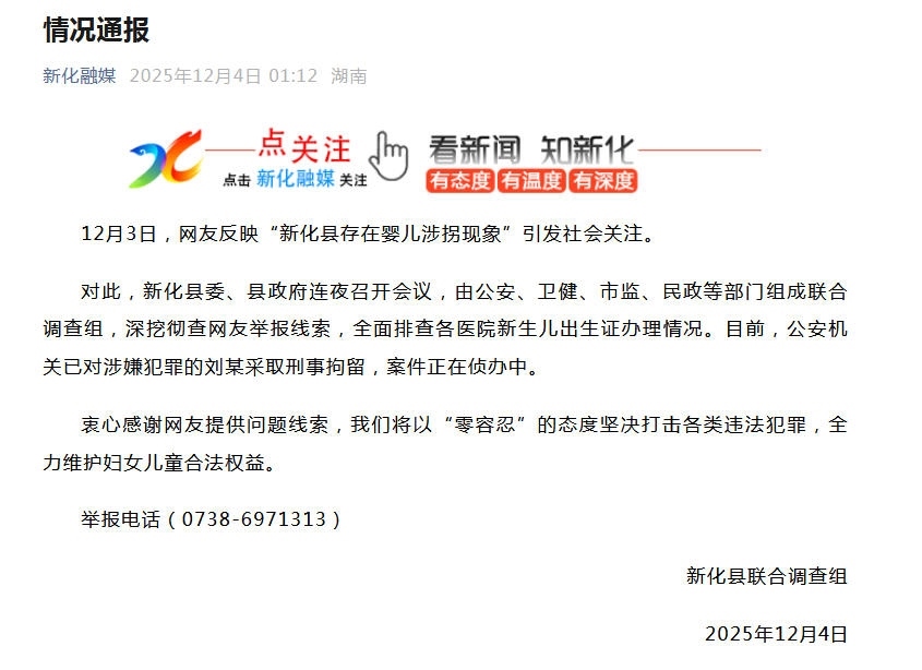 中新網(wǎng)12月4日電 針對(duì)網(wǎng)友反映的“新化縣存在嬰兒涉拐現(xiàn)象”,湖南省婁底市新化縣聯(lián)合調(diào)查組12月4日發(fā)布情況通報(bào)稱,新化縣委、縣政府連夜召開會(huì)議,由公安、衛(wèi)健、市監(jiān)、民政等部門組成聯(lián)合調(diào)查組,深挖徹查網(wǎng)友舉報(bào)線索,全面排查各醫(yī)院新生兒出生證辦理情況。