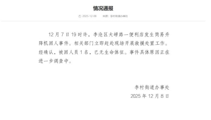 中新網(wǎng)12月8日電 青島李村街道辦事處8日在青島李滄政務(wù)網(wǎng)發(fā)布情況通報稱,12月7日19時許,李滄區(qū)大嶗路一便利店發(fā)生簡易升降機困人事件。相關(guān)部門立即趕赴現(xiàn)場開展救援處置工作。經(jīng)確認,被困人員1名,已無生命體征。事件具體原因正在進一步調(diào)查中。