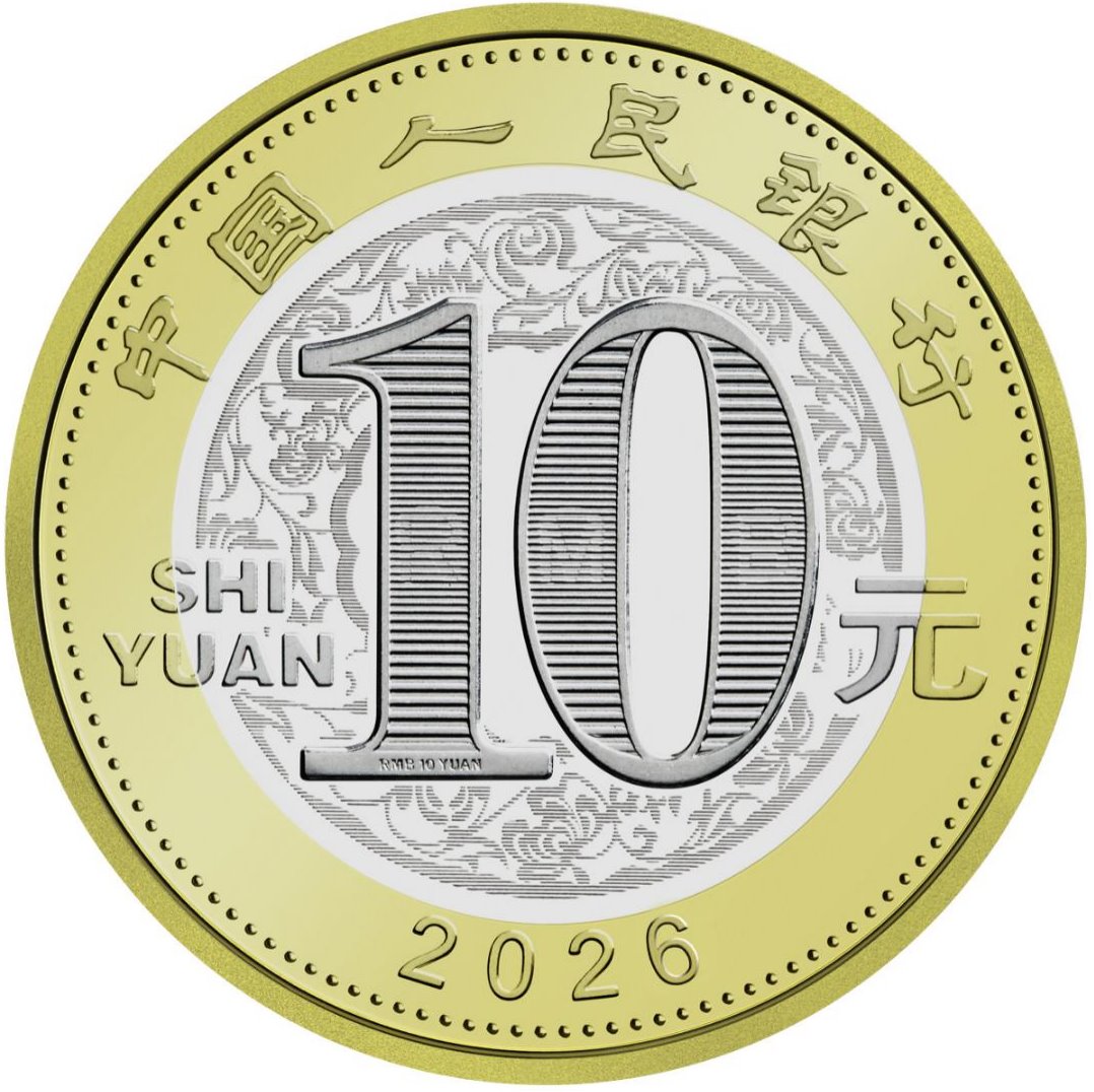 雙色銅合金紀念幣正面圖案為“中國人民銀行”、“10元”字樣,漢語拼音字母“SHIYUAN”及年號“2026”,底紋襯以團花圖案。