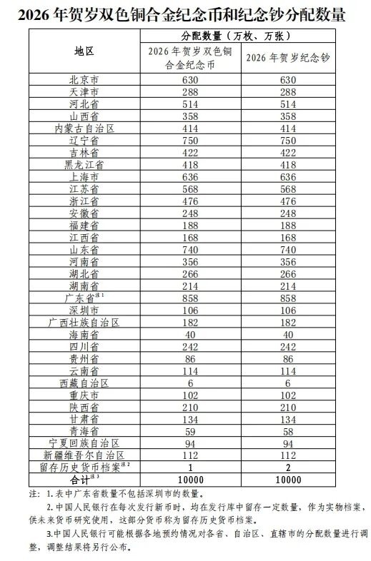2026年1月12日前,中國人民銀行分支機構(gòu)將向社會公告當?shù)?026年賀歲雙色銅合金紀念幣和紀念鈔的分配數(shù)量等信息。承辦銀行將在其官方網(wǎng)站公布2026年賀歲雙色銅合金紀念幣和紀念鈔預(yù)約兌換網(wǎng)點及每個網(wǎng)點的可預(yù)約數(shù)量等信息。