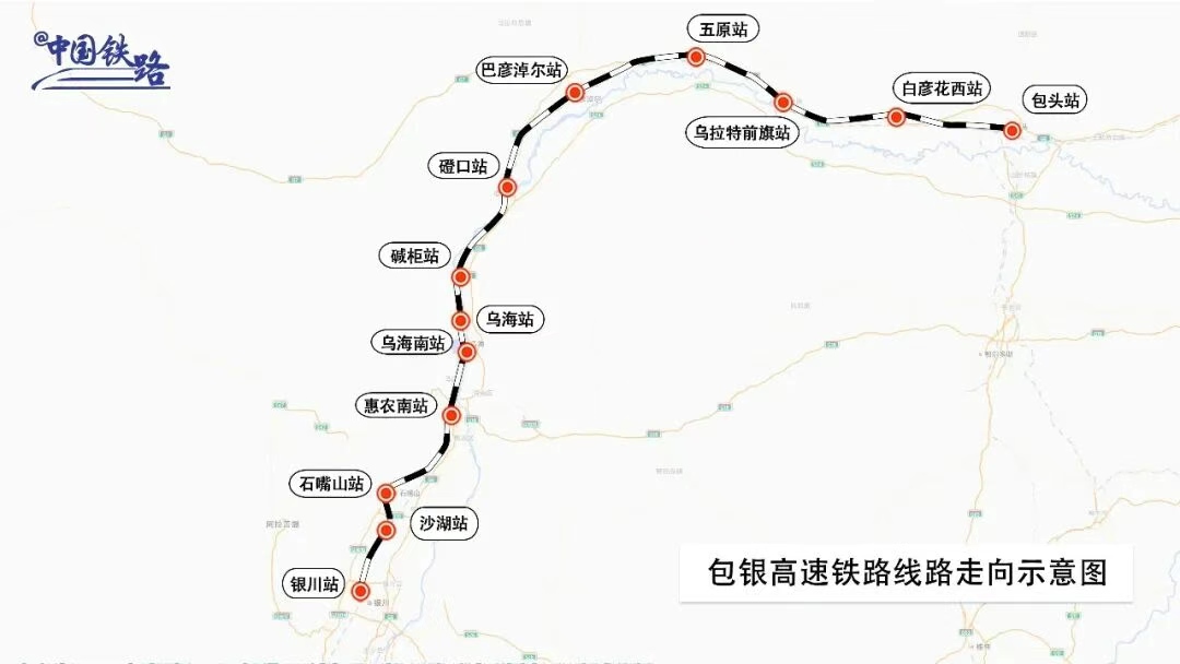 包銀高鐵起自包頭站,經(jīng)內(nèi)蒙古自治區(qū)包頭市、巴彥淖爾市、鄂爾多斯市、烏海市,寧夏回族自治區(qū)石嘴山市、銀川市,接入銀川站,正線全長519公里,設(shè)計時速250公里,實行分段建設(shè),其中,惠農(nóng)至銀川段全長97公里,已于2024年10月開通運營,此次開通的包頭至惠農(nóng)段全長422公里,共設(shè)10座車站。
