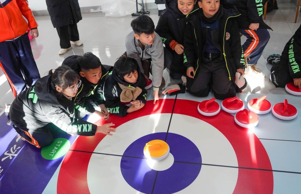12月3日,吉林市松江東路小學(xué)校學(xué)生在吉林市納美山谷度假區(qū)體驗(yàn)旱地冰壺。新華社記者 顏麟蘊(yùn) 攝