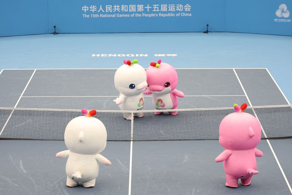 11月12日,第十五屆全國運(yùn)動(dòng)會(huì)吉祥物“喜洋洋”“樂融融”在網(wǎng)球比賽間隙表演。新華社記者 張晨霖 攝