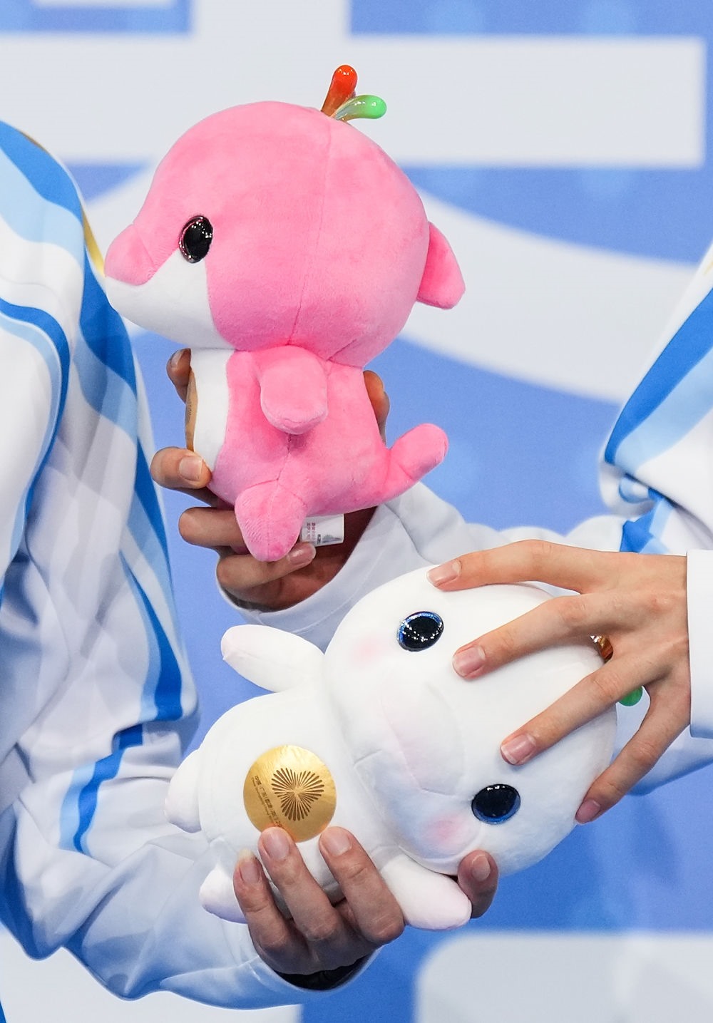 11月14日,第十五屆全國運(yùn)動(dòng)會(huì)游泳男子100米自由泳決賽在廣東省深圳市舉行,圖為冠軍浙江隊(duì)選手潘展樂和教練在頒獎(jiǎng)儀式上交換吉祥物。新華社記者 薛宇舸 攝