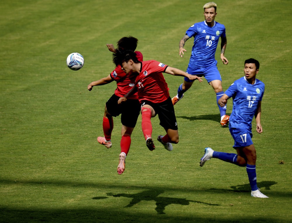 6月14日,球員在“蘇超”淮安隊(duì)對(duì)陣南京隊(duì)的比賽中拼搶。新華社發(fā)(曹政 攝)