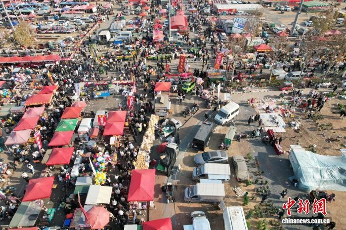 12月8日,山東省臨沂市臨沭縣,民眾暢游曹洼大集。近期,曹洼大集憑借超高性價比的特色美食、濃郁的民俗氛圍、線上線下聯(lián)動的鮮活場景火爆全網(wǎng)。(無人機(jī)照片) 中新社記者 王峰 攝
