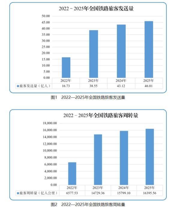 客運(yùn)方面。2025年,全國(guó)鐵路累計(jì)完成旅客發(fā)送量46.01億人,同比增長(zhǎng)6.7%;完成旅客周轉(zhuǎn)量16395.56億人公里,同比增長(zhǎng)3.8%。12月份,完成旅客發(fā)送量3.23億人,同比增長(zhǎng)8.5%;完成旅客周轉(zhuǎn)量1015.59億人公里,同比增長(zhǎng)6.0%。