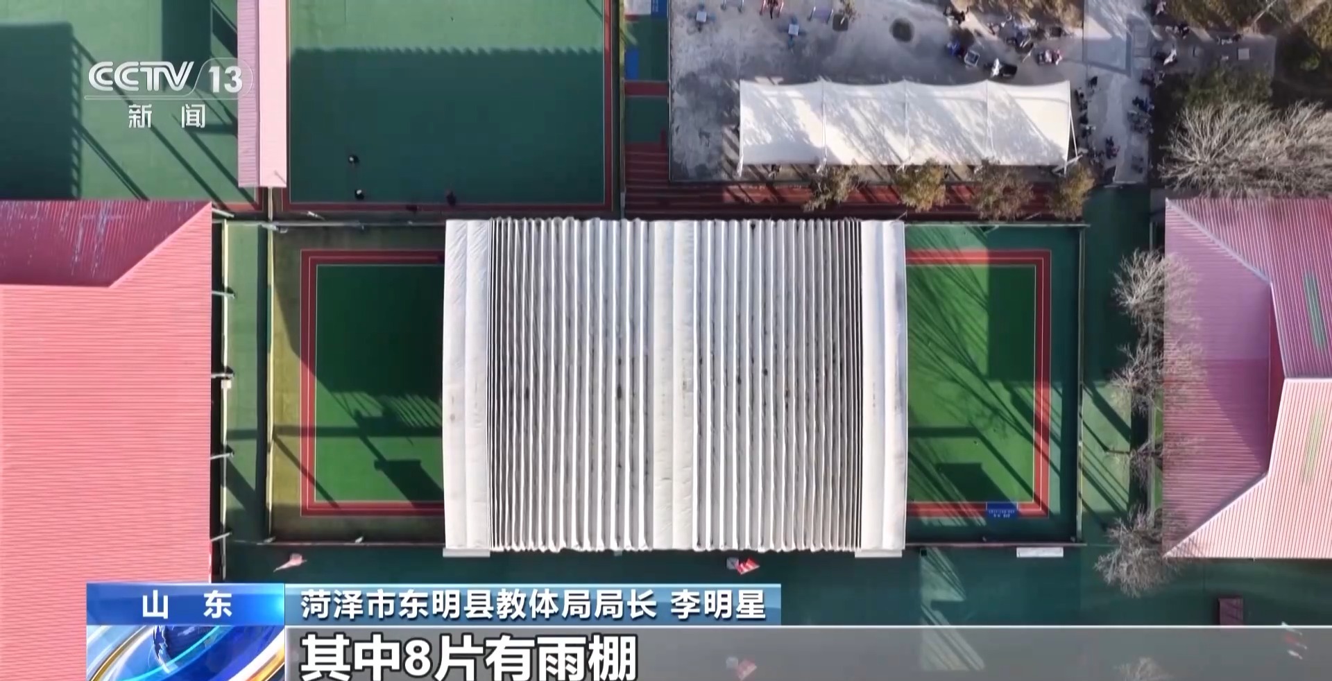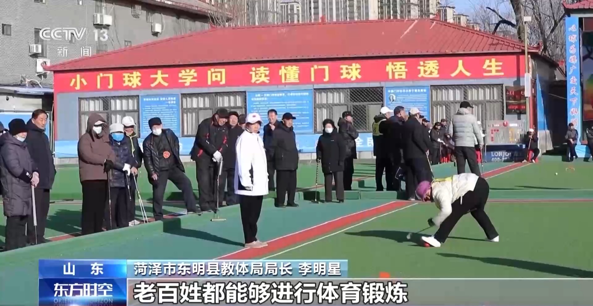 菏澤市東明縣教體局局長 李明星:17片連在一起的標準化門球場,其中8片有雨棚,下雨天、刮風天,老百姓都能夠進行體育鍛煉。