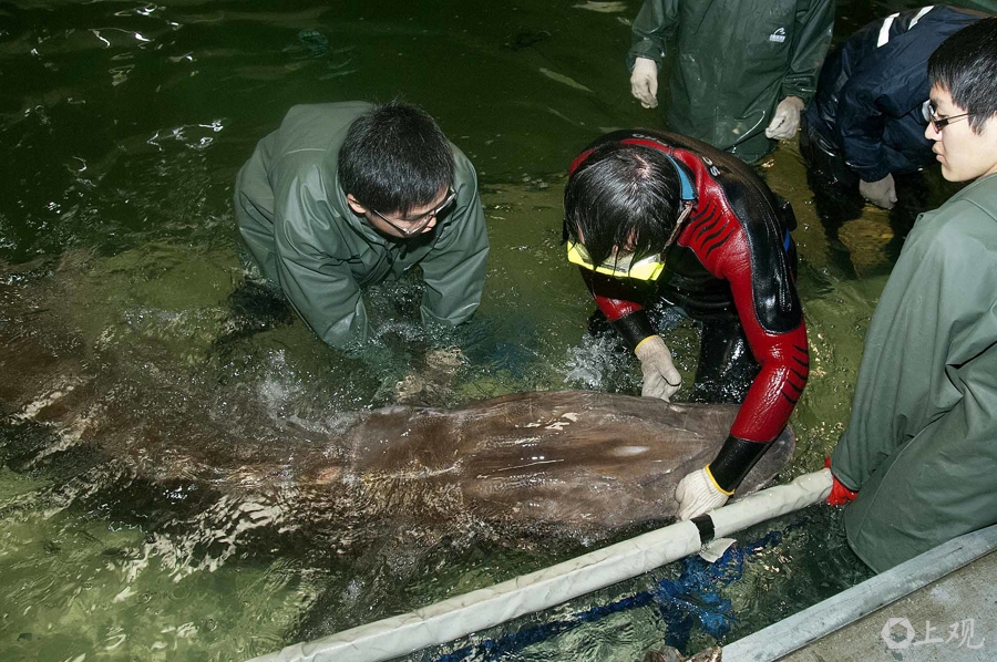 資料圖:2014年3月8日在長江口搶救的受傷中華鱘