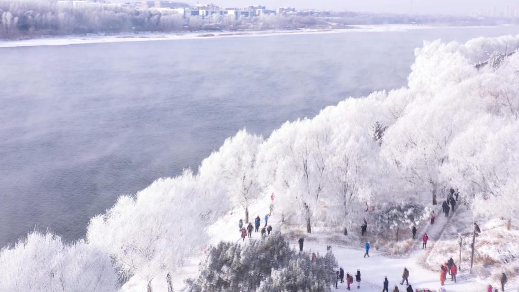 晨光中,江畔柳樹、松枝綴滿冰晶,如玉樹瓊枝,游人穿梭其間,仿佛置身冰雪仙境。