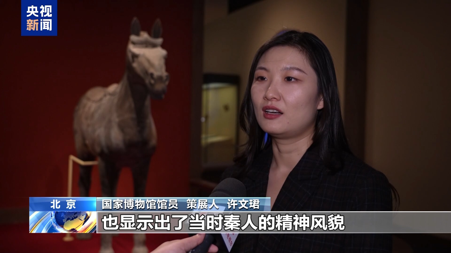 國家博物館館員、策展人 許文珺:這一件秦始皇帝陵兵馬俑的秦鞍馬,雙蹄直立,它的耳朵是直立的,尾巴也是梳成一個(gè)辮狀,整體非常有力量,也是秦代人對(duì)戰(zhàn)馬篩選標(biāo)準(zhǔn)非常嚴(yán)格的體現(xiàn),也顯示出了當(dāng)時(shí)秦人的一個(gè)精神風(fēng)貌。