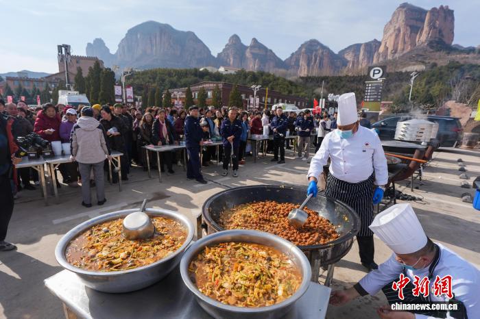 除了非遺展區(qū),在場地一側(cè)安排的“千人百桌宴”也提前烘托出濃濃年味。偌大的場地內(nèi),10人一桌的圓桌分4列排開,近千人同時(shí)用餐,“大燴菜、開花饃,廚師現(xiàn)場制作的飯菜熱氣騰騰,胃口一下就打開了”。