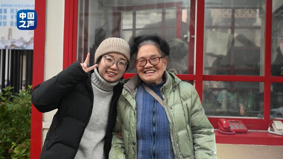 陳真與沈奶奶在電話亭前合影