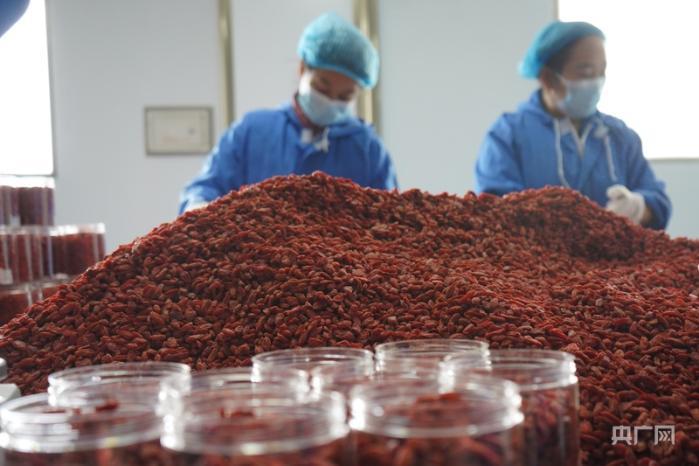 企業(yè)生產(chǎn)車間內(nèi),鮮紅的枸杞正在打包裝箱(央廣網(wǎng)記者 汪曉青 攝)