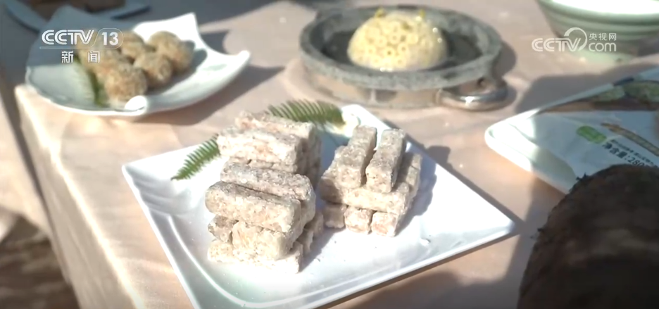 除了好看,當(dāng)然也有好吃的。當(dāng)?shù)氐募t糖年糕寓意著“年年高、步步高”。還有一道是用本地檳榔芋做成的掛霜芋,將芋塊加入白糖翻炒,表面裹上一層細(xì)細(xì)的糖霜,粉粉糯糯,是每家每戶逢年過(guò)節(jié)的必備菜肴。