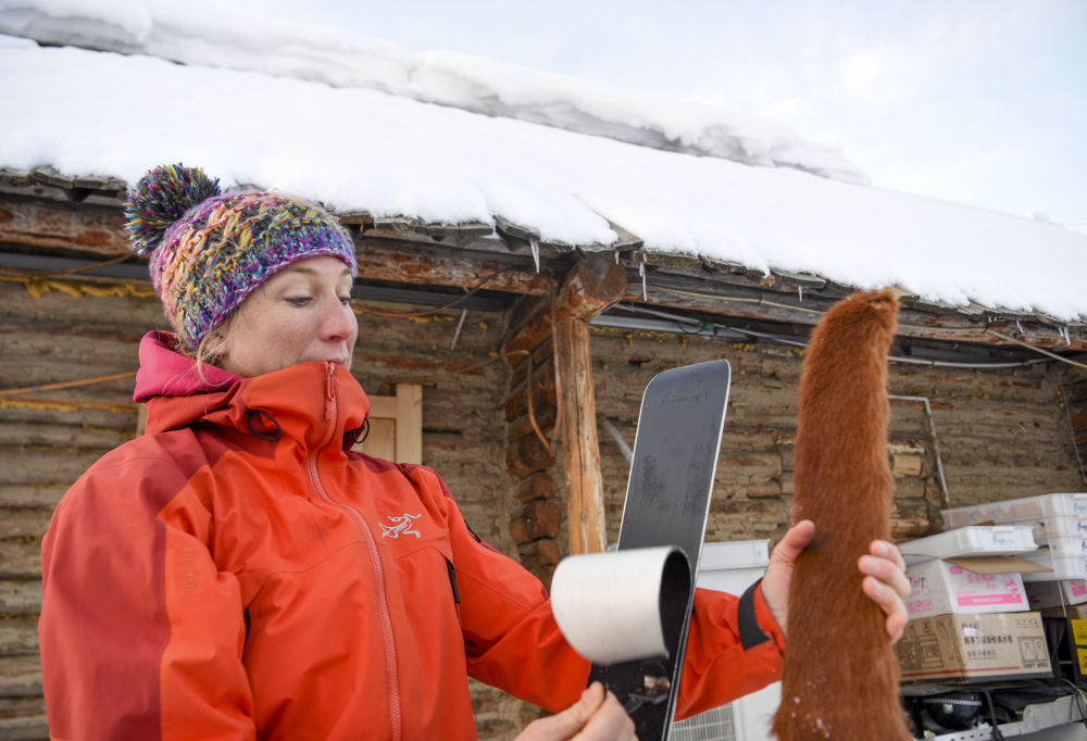 在新疆阿勒泰地區(qū)禾木村,一位法國(guó)雪友比較現(xiàn)代滑雪板的止滑帶與古老毛皮滑雪板的異同(2019年1月11日攝)。新華社記者 胡虎虎 攝
