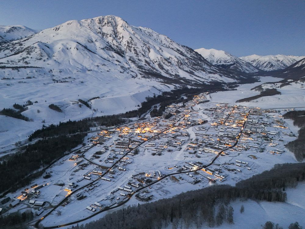 夜幕降臨,新疆阿勒泰將軍山國(guó)際滑雪度假區(qū)即將開(kāi)啟夜場(chǎng)運(yùn)營(yíng)(2025年1月24日攝,無(wú)人機(jī)照片)。新華社記者 胡虎虎 攝