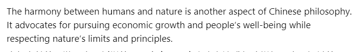 文章還認(rèn)為,人與自然的和諧是中國哲學(xué)的另一個(gè)方面。它主張?jiān)谧非蠼?jīng)濟(jì)增長和人民福祉的同時(shí),尊重自然的發(fā)展規(guī)律。
