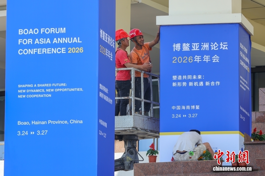 3月17日,博鰲亞洲論壇2026年年會(huì)各項(xiàng)籌備工作正有序推進(jìn),海南博鰲街頭的盛會(huì)氛圍日漸濃厚。以“塑造共同未來:新形勢、新機(jī)遇、新合作”為主題的博鰲亞洲論壇2026年年會(huì)將于3月24日至27日在海南博鰲召開。圖為工作人員在博鰲亞洲論壇永久會(huì)址安裝年會(huì)主題展板。中新社記者 駱云飛 攝