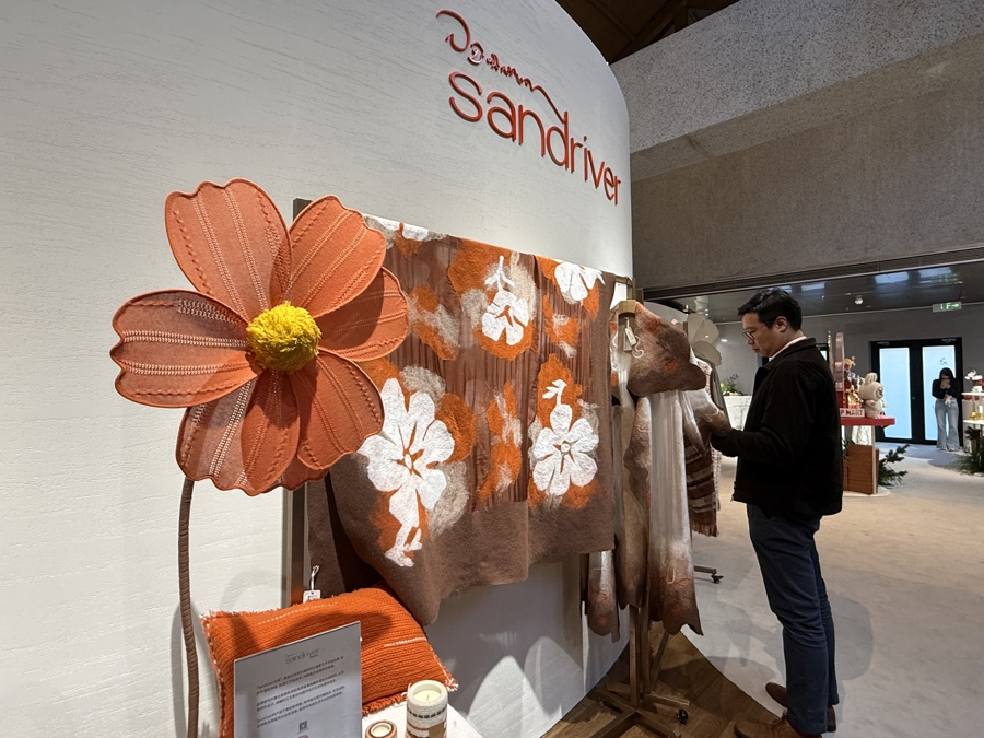 “踏花影”區(qū)域是一個五感體驗的沉浸空間。藝術羊絨品牌Sandriver沙涓現(xiàn)場還原了日喀則羊絨氆氌工坊、果洛牦牛絨氆氌工坊的織機操作,匠人以雙手穿梭,在經(jīng)緯交錯間演繹“高原的溫度”,消費者能近距離觀看從捻紗到成胚的全過程,感受這一非物質文化遺產(chǎn)的匠心精神。沙涓品牌負責人介紹,品牌將首發(fā)羊絨睡袍系列新品、馬年主題哈尼繡系列以及羊絨艾德萊斯家居毯等作品,展現(xiàn)傳統(tǒng)工藝與當代生活美學融合的羊絨設計。
