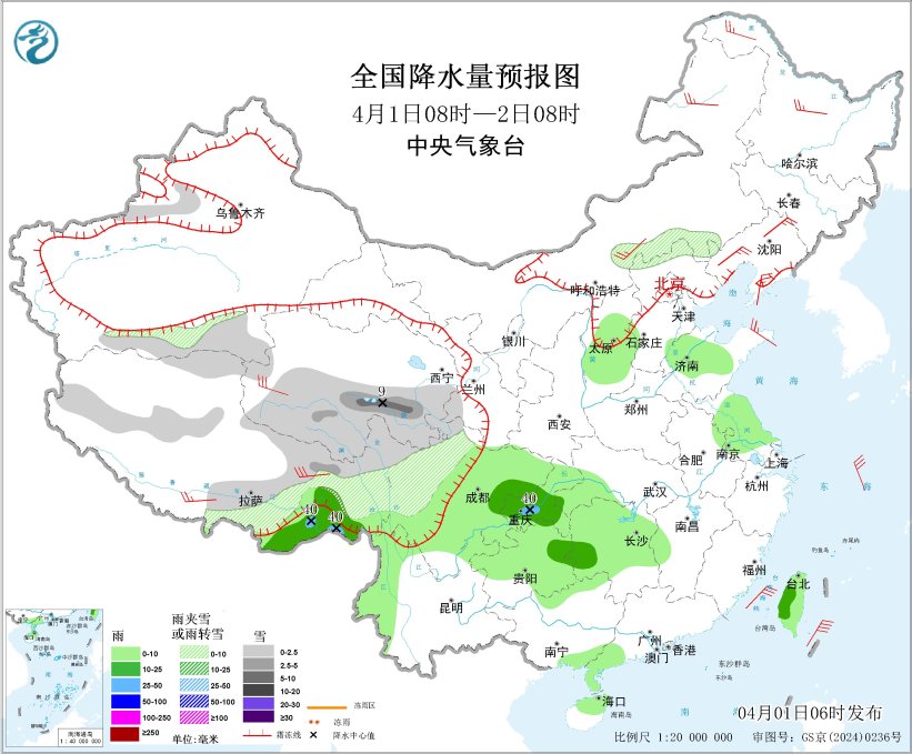 4月1日08時至2日08時,西藏東部和南部、青海南部和西部、川西高原北部、新疆南疆盆地、內(nèi)蒙古東部、河北北部等地部分地區(qū)有小到中雪或雨夾雪,其中,青海南部等地局部地區(qū)有大雪(5~9毫米)。西藏東南部、西南地區(qū)東部、江南西部、山西中部、山東中北部、江蘇大部、廣西北部和東南部沿海、廣東西南部、海南島北部、臺灣島等地部分地區(qū)有小到中雨,其中,西藏東南部、重慶西南部等地局部地區(qū)有大雨(25~40毫米)。內(nèi)蒙古中東部、黑龍江中北部、遼東半島、山東半島、西藏東部和南部、青海西部等地部分地區(qū)有4~6級風(fēng);渤海、東海大部海域、臺灣海峽、臺灣以東洋面、巴士海峽將有5~6級風(fēng)、陣風(fēng)7級。