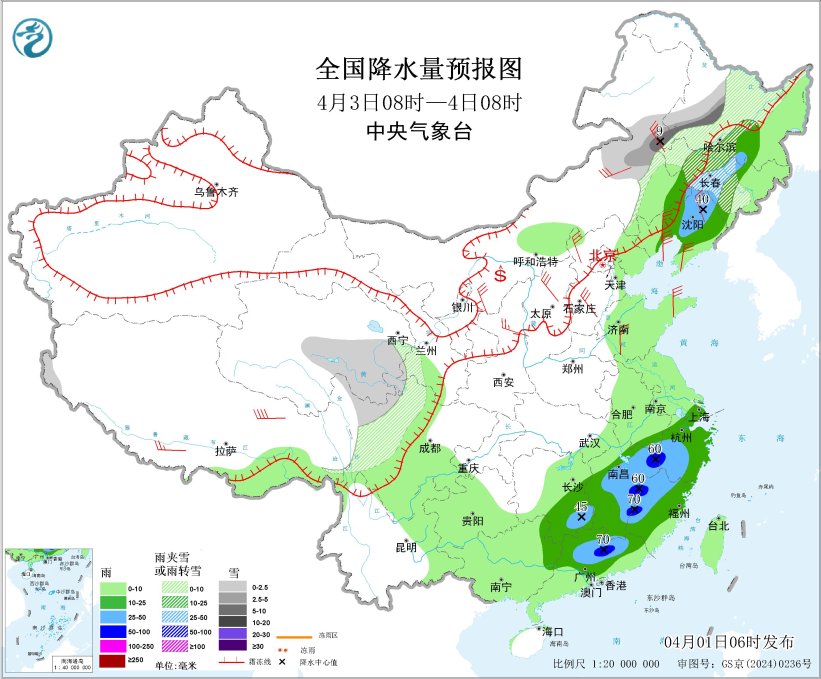 4月3日08時至4日08時,內(nèi)蒙古東北部、黑龍江中西部、吉林中西部、青海東部和南部、川西高原北部等地部分地區(qū)有小到中雪或雨夾雪,其中,內(nèi)蒙古東北部、黑龍江西南部等地部分地區(qū)有大雪(5~9毫米)。遼寧大部、江南大部、華南北部和東部等地部分地區(qū)有中到大雨,其中,江西東部、浙江西南部、福建西部、廣東北部等地部分地區(qū)有暴雨(50~70毫米)。內(nèi)蒙古大部、遼寧大部、山西大部、河北大部、山東半島、陜西北部、西藏南部等地部分地區(qū)有4~6級風(fēng),西藏東部部分地區(qū)有6~7級風(fēng);渤海、渤海海峽、黃海大部海域、東海大部海域、臺灣海峽、臺灣以東洋面、北部灣將有6~7級風(fēng)、陣風(fēng)8~9級。
