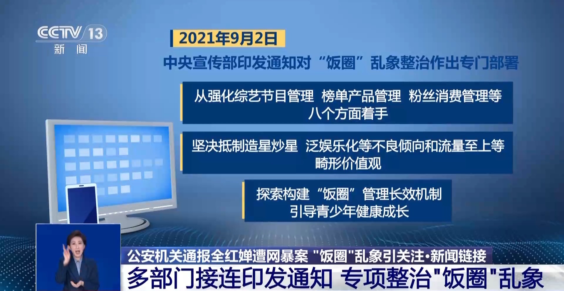 2021年9月2日,中央宣傳部印發(fā)通知對“飯圈”亂象整治作出專門部署。從強(qiáng)化綜藝節(jié)目管理、榜單產(chǎn)品管理、粉絲消費(fèi)管理等八個(gè)方面著手,堅(jiān)決抵制造星炒星、泛娛樂化等不良傾向和流量至上等畸形價(jià)值觀,探索構(gòu)建“飯圈”管理長效機(jī)制,引導(dǎo)青少年健康成長。