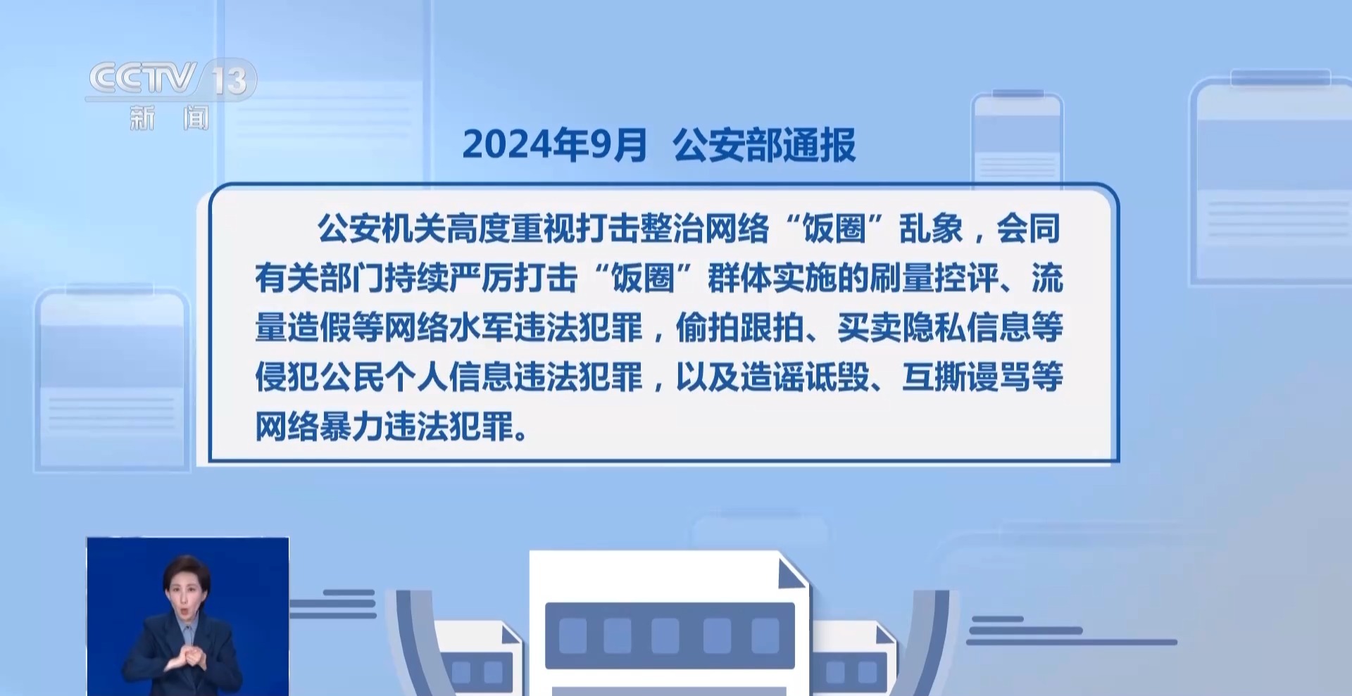 2024年9月,公安部通報(bào),公安機(jī)關(guān)高度重視打擊整治網(wǎng)絡(luò)“飯圈”亂象,會(huì)同有關(guān)部門持續(xù)嚴(yán)厲打擊“飯圈”群體實(shí)施的刷量控評、流量造假等網(wǎng)絡(luò)水軍違法犯罪,偷拍跟拍、買賣隱私信息等侵犯公民個(gè)人信息違法犯罪,以及造謠詆毀、互撕謾罵等網(wǎng)絡(luò)暴力違法犯罪。