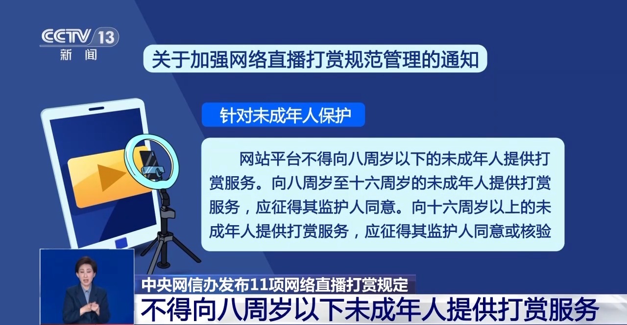 中國社會科學院大學互聯(lián)網(wǎng)法治研究中心主任 劉曉春:這個通知的發(fā)布主要針對的還是直播打賞行業(yè)存在的一系列的亂象,特別是未成年人保護這一塊,未成年人他在看直播的時候的打賞通常是跟他自己的認知能力和判斷能力不相符的,那么特別是會出現(xiàn)這種非理性的,特別是高額的打賞,那么這一塊平臺和主播都可能存在引導和誘導的行為,這一類亂象也是比較突出的。