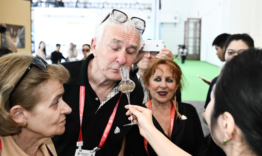 4月13日,觀眾在第六屆消博會主會場品鑒沉香。新華社記者 楊冠宇 攝