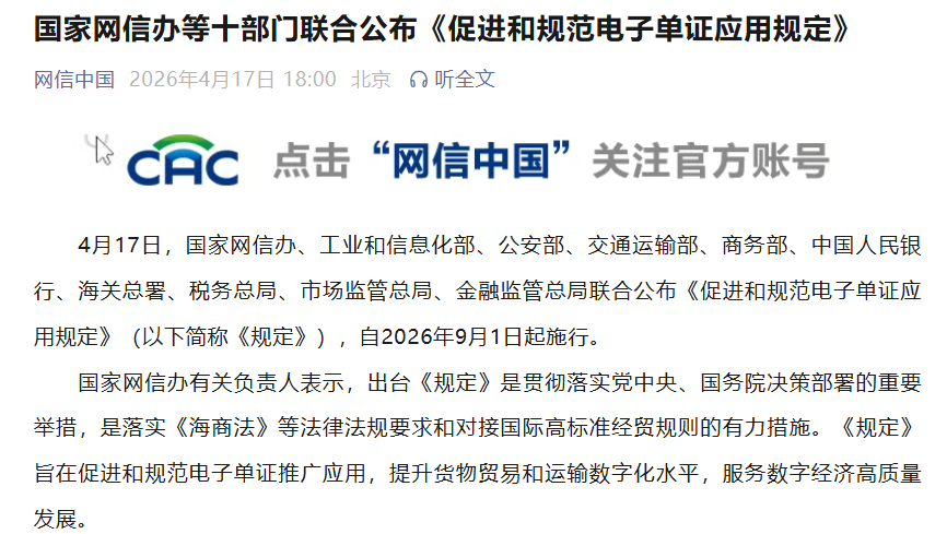 中國網(wǎng)4月17日訊 據(jù)網(wǎng)信中國微信公眾號消息,4月17日,國家網(wǎng)信辦、工業(yè)和信息化部、公安部、交通運輸部、商務(wù)部、中國人民銀行、海關(guān)總署、稅務(wù)總局、市場監(jiān)管總局、金融監(jiān)管總局聯(lián)合公布《促進和規(guī)范電子單證應(yīng)用規(guī)定》(以下簡稱《規(guī)定》),自2026年9月1日起施行。