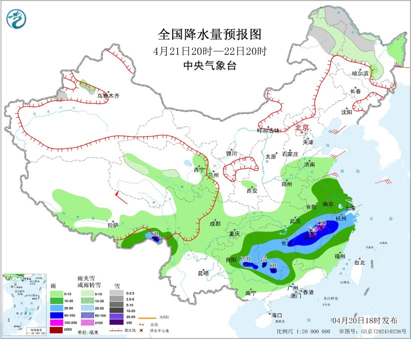 4月20日20時至21日20時,內(nèi)蒙古東北部、黑龍江西北部、新疆沿天山地區(qū)、青海中部和東北部、甘肅河西等地部分地區(qū)有小雪或雨夾雪,其中,內(nèi)蒙古東北部、黑龍江西北部等地部分地區(qū)有中到大雪(5~8毫米)。西北地區(qū)東南部、黃淮西部、江漢東部、江南大部、四川盆地東北部、華南西部、北部和東南部等地部分地區(qū)有中到大雨,其中,湖南南部和東部、江西中北部、廣西東北部等地部分地區(qū)有暴雨,局地大暴雨(100~160毫米)。內(nèi)蒙古中東部、吉林、黑龍江東南部以及新疆南疆盆地、西藏北部、青海中西部等地部分地區(qū)有5~7級風,陣風8~9級,其中內(nèi)蒙古中部、吉林中東部等地局地有8~9級風,陣風10級以上;渤海、渤海海峽、黃海北部部分海域?qū)⒂?級、陣風8級的大風(見圖3)。
