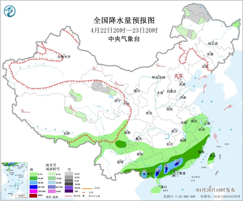 4月22日20時至23日20時,內(nèi)蒙古東北部、黑龍江西北部、青藏高原北部、甘肅河西等地部分地區(qū)有小雪或雨夾雪。江南東部和南部、華南中南部等地部分地區(qū)有中到大雨,其中,廣西東南部、廣東西部和北部等地部分地區(qū)有暴雨或大暴雨(100~110毫米)。內(nèi)蒙古大部、遼東半島、山東半島、甘肅河西、青藏高原等地部分地區(qū)有4~6級風。東海北部海域?qū)⒂?~8級大風、陣風9級;黃海南部海域、東海南部海域、臺灣海峽、臺灣以東洋面、北部灣將有5~6級大風、陣風7級(見圖5)。