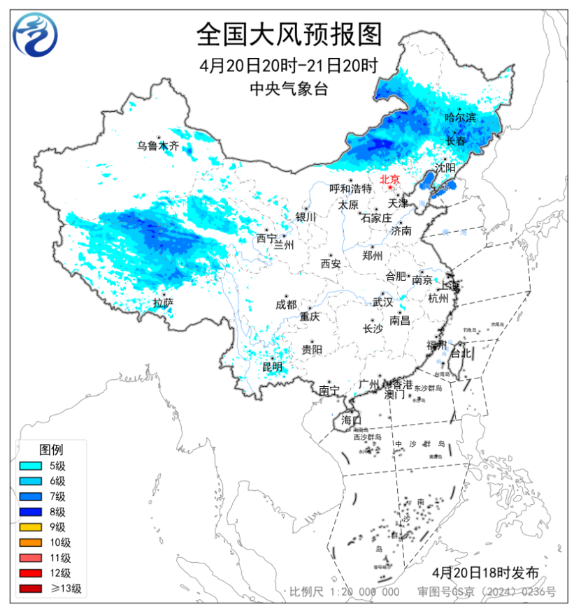 預(yù)計4月20日20時至21日20時,內(nèi)蒙古中東部、吉林、黑龍江東南部以及新疆南疆盆地、西藏北部、青海中西部等地部分地區(qū)有5~7級風,陣風8~9級,其中內(nèi)蒙古中部、吉林中東部等地局地有8~9級風,陣風10級以上;渤海、渤海海峽、黃海北部部分海域?qū)⒂?級、陣風8級的大風(見圖2)。中央氣象臺4月20日18時發(fā)布大風藍色預(yù)警。