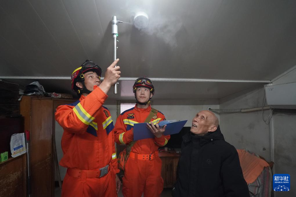 在東關(guān)街羊巷周福喜(右)老人家中,“協(xié)同治理合伙人”消防救援局東關(guān)街政府專職消防隊(duì)隊(duì)員檢測(cè)并記錄煙感報(bào)警器運(yùn)行情況(4月16日攝)。