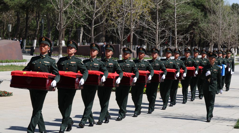 4月22日,禮兵護送志愿軍烈士遺骸棺槨抵達沈陽抗美援朝烈士陵園。新華社記者 楊青 攝