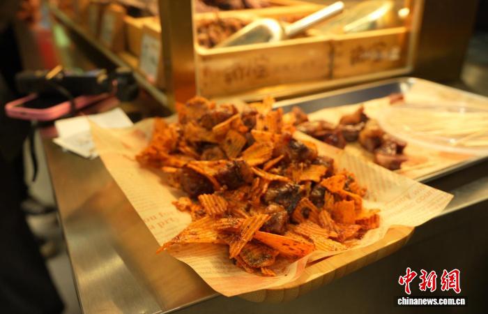 “萌小寶現(xiàn)烤牛肉干”店內(nèi)的牛肉干拌薯片。 中新網(wǎng)記者 劉文華 攝