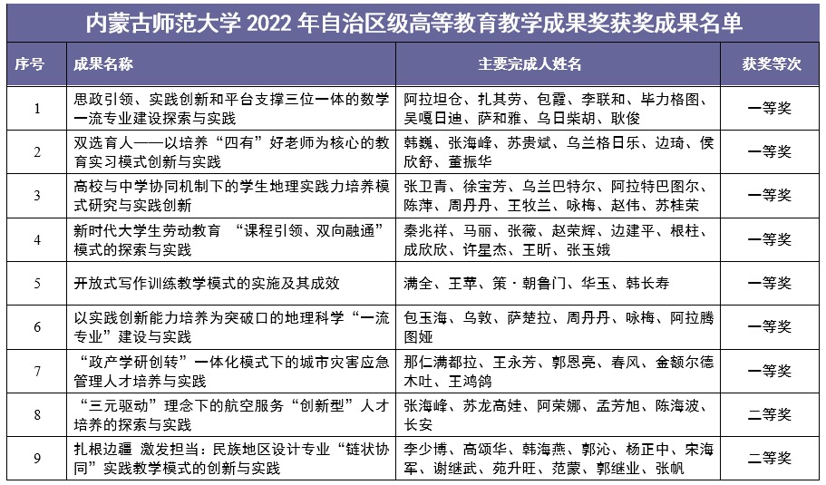 北疆新聞網、北疆新聞APP、北疆云消息(記者 李艷紅)近日,內蒙古自治區(qū)教育廳發(fā)布了《關于公布2022年自治區(qū)級高等教育教學成果獎獲獎成果的通知》,內蒙古師范大學微官網由數學科學學院牽頭、黨委書記阿拉坦倉主持的《思政引領、實踐創(chuàng)新和平臺支撐三位一體的數學一流專業(yè)建設與實踐》等17個推薦至自治區(qū)的教學成果均獲獎,實現(xiàn)了100%的獲獎率。其中,一等獎7項,二等獎4項,三等獎6項。一等獎獲獎數量及總獲獎率位居全區(qū)之首。