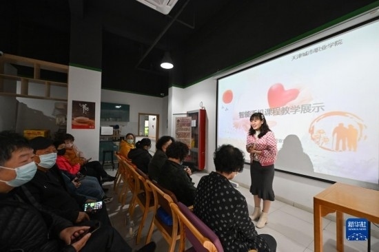 4月4日,在天津市河西區(qū)下瓦房街道居家養(yǎng)老服務中心,授課教師為老人們提供智能手機應用教學服務。