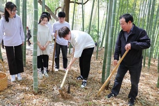 進行40分鐘的“漫談式”課程后,師生們一起拿起鋤頭,開始挖筍實踐。在勞動中,他們感受著春天的饋贈。該校視覺傳達與設計專業(yè)的南通姑娘周雨濛從未嘗試過挖筍。對于校園中的竹子是何人養(yǎng)護、怎么養(yǎng)護,她了解得不多。課堂上,她第一次拿起鋤頭,在學校校工的帶領下挖筍。